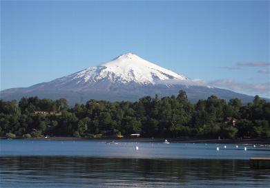 View from outside the cabin; Lake Villarrica with Volcan Villarrica in the background.