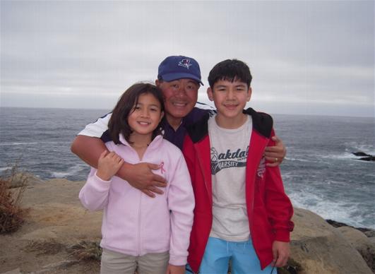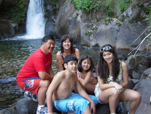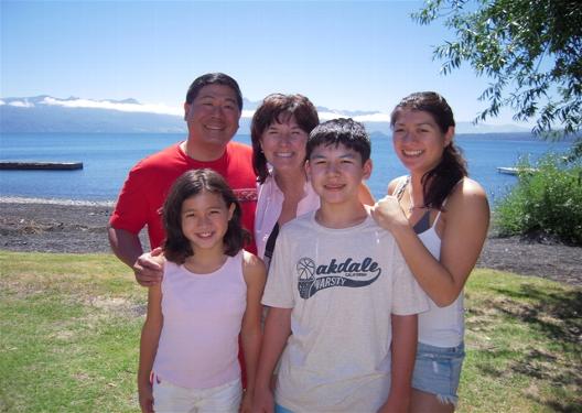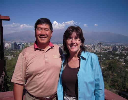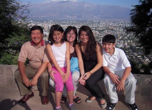 The Tang family posing in Cerro San Cristobal with downtown Santiago in the background.